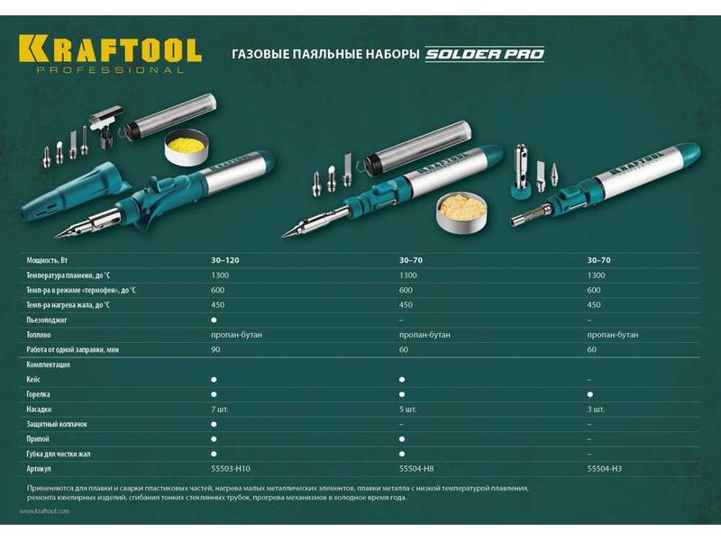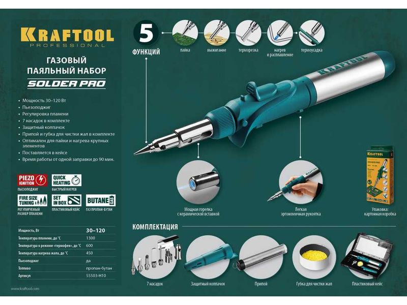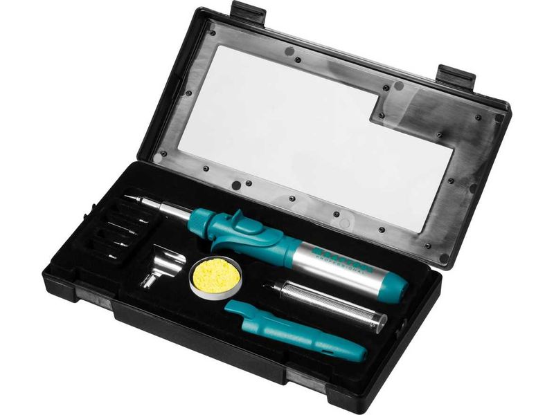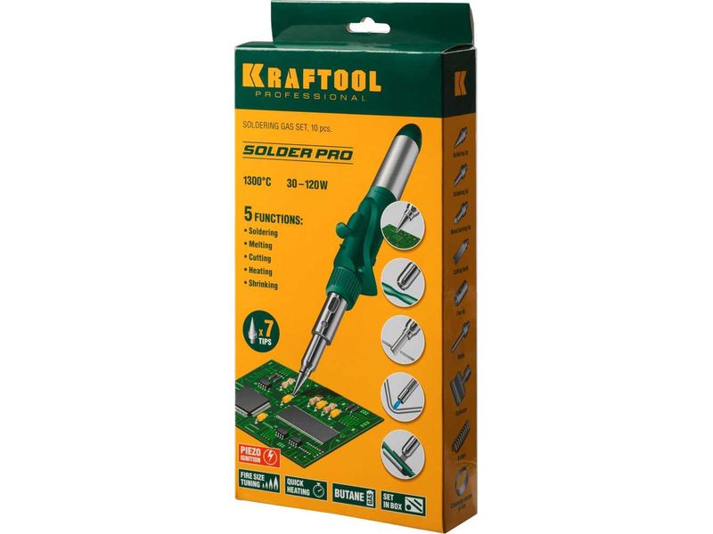 Набор KRAFTOOL PRO : Паяльник газовый, 3в1, пьезоподжиг, 5 насадок, припой, защитный колпачок, чистка жал, 1300С