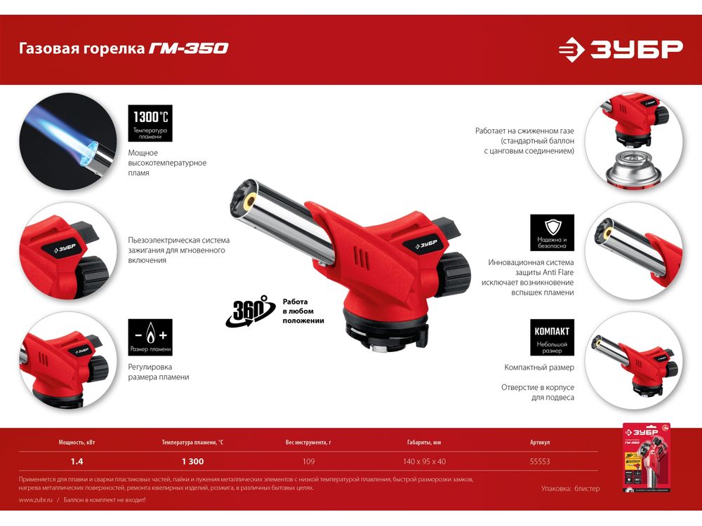 ЗУБР ГМ-350, газовая горелка с пъезоподжигом, на баллон, цанговое соединение, 1300°C
