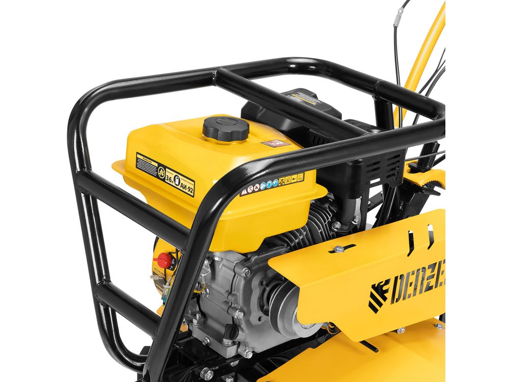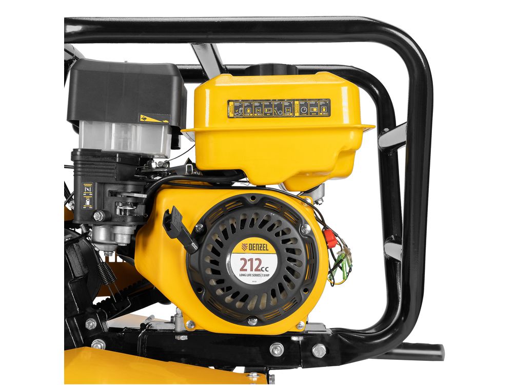 Мотоблок Denzel DPT-670S-PRO 56446 с ременным сцеплением, двигателем объемом 212 см3 и мощностью 7 л.с., с коробкой передач 6 вперед/2 назад и шкивом отбора мощности, комплектуется 24 фрезами (3х4). Предназначен для выполнения земляных работ: прополки, вспахивания, боронования грунта, перевозки грузов и т.д.