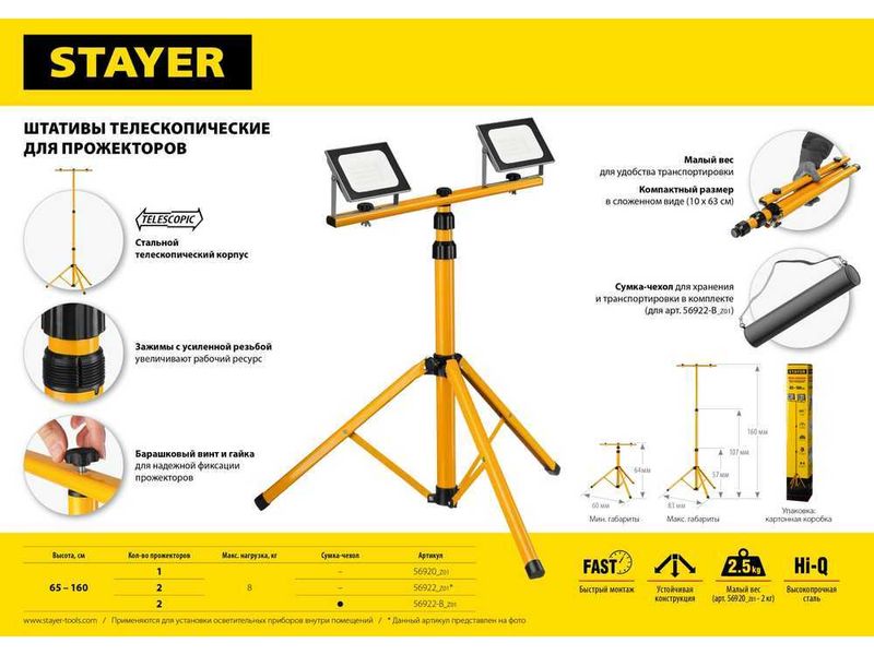 Штатив STAYER предназначен для установки двух прожекторов. Используется внутри помещений. Регулируется по высоте от 65 до 160 см. Легко и быстро устанавливается. Имеет планку для одновременной установки двух прожекторов. Изготовлен из высокопрочной стали и выдерживает максимальную нагрузку — 8 кг. Размер в сложенном виде — 10х63 см. Диаметр основания треноги — 96 см.