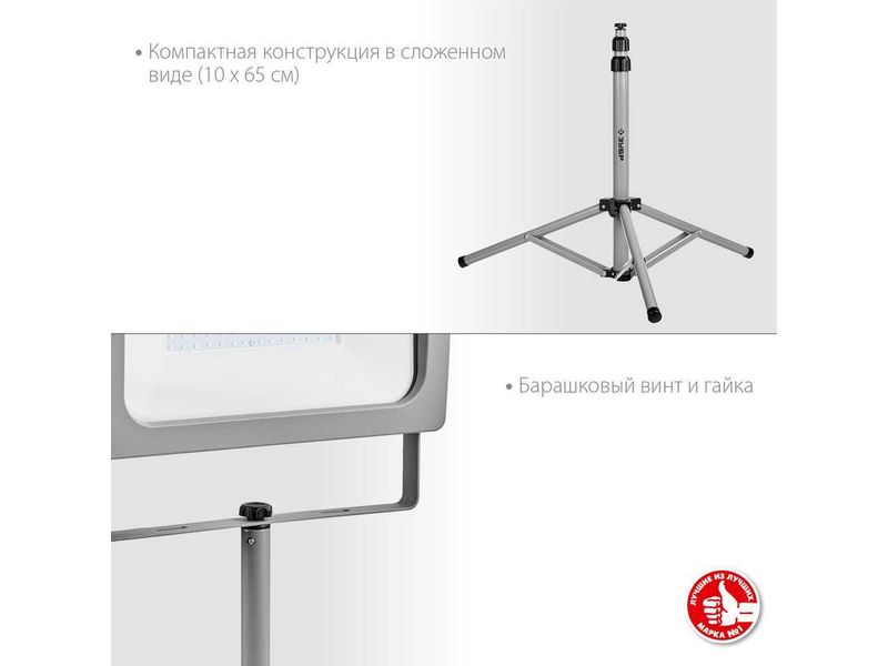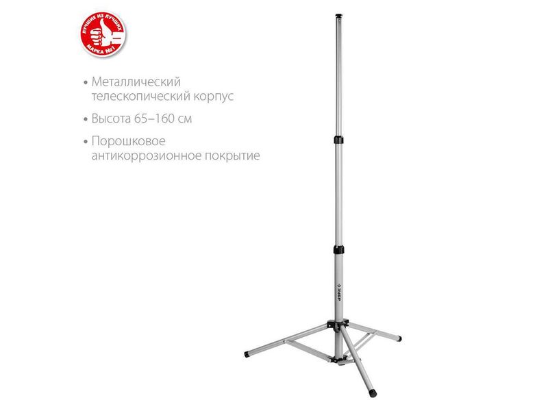 Штатив ЗУБР предназначен для установки прожекторов. Телескопическая конструкция позволяет регулировать высоту установки от 65 до 160 см. Легкий и быстрый монтаж. Изготовлен из высокопрочной стали и выдерживает нагрузку до 8 кг. Размер в сложенном виде — 10х63 см. Диаметр основания треноги — 96 см.
