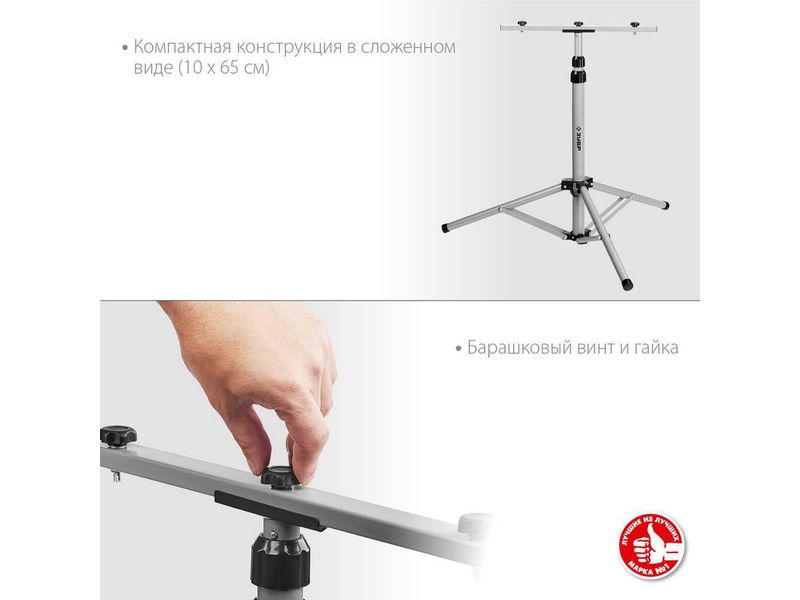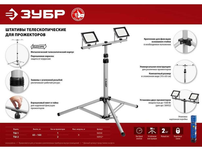 Штатив ЗУБР предназначен для установки прожекторов. Телескопическая конструкция позволяет регулировать высоту установки от 65 до 160 см. Горизонтальная перекладина позволяет одновременно установить 2 прожектора. Легкий и быстрый монтаж. Изготовлен из высокопрочной стали и выдерживает нагрузку до 8 кг. Размер в сложенном виде — 10х63 см. Диаметр основания треноги — 96 см.