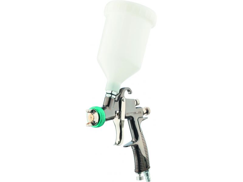 Профессиональный пневматический краскораспылитель гравитационного типа Stels AG 950 LVLP 57367 с соплом диаметром 1,5 мм подходит для проведения окрасочных работ, покрытия керамики глазурью, грунтовки стен, побелки потолков, лакирования дерева. Технология «Низкий объем, низкое давление» (Low Volume Low Pressure) позволяет уменьшить расход окрасочного материала до 140-190 мл/мин и добиться его 80-процентного переноса на обрабатываемую поверхность. Поэтому краскопульт отлично подойдет для применения как в быту, так и на производствах.