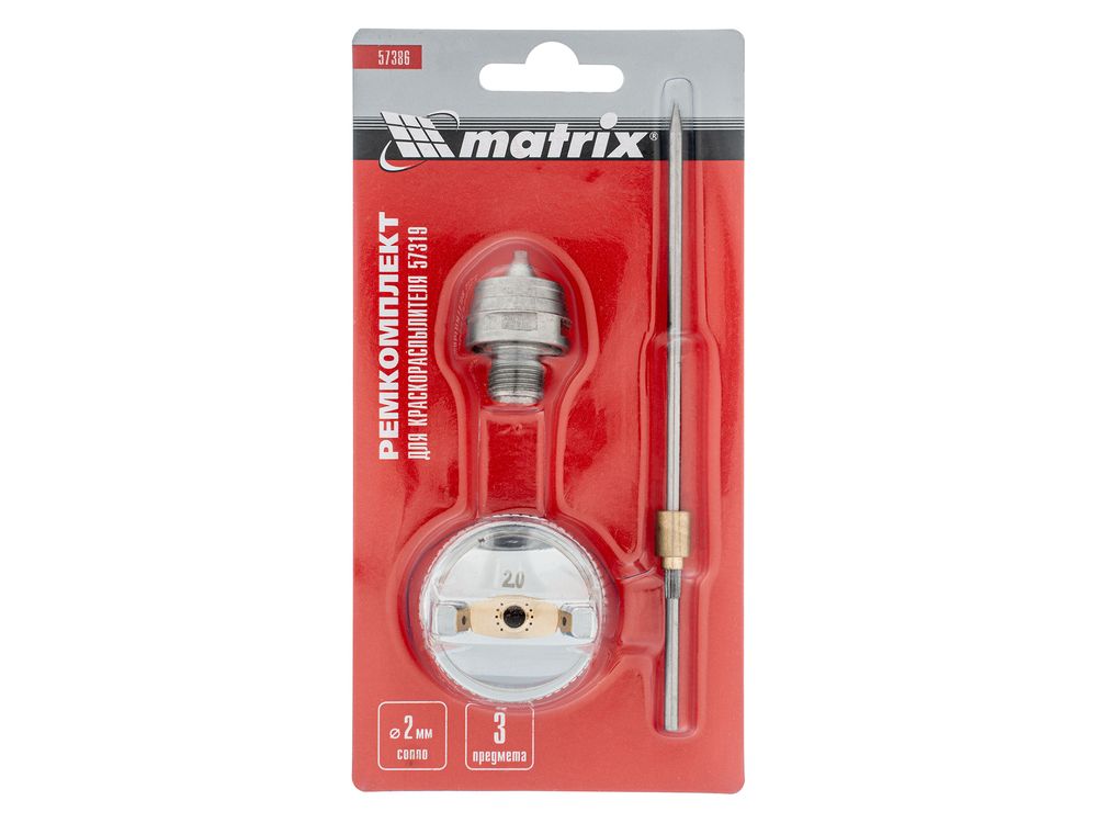 Комплект Matrix 57386 для краскораспылителя Matrix 57319 включает в себя 3 предмета: сопло диаметром 2 мм, иглу и форсунку. Их можно использовать для ремонта инструмента или расширения его функциональных возможностей.