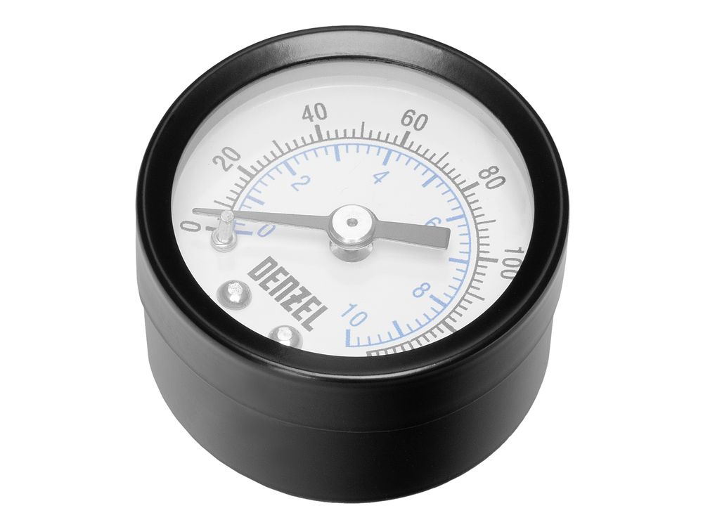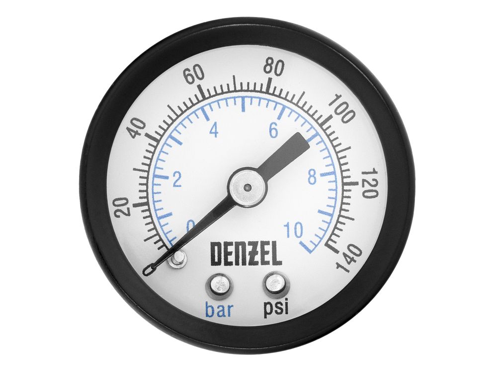 Воздушный манометр Denzel G10 57402 диаметром 40 мм, с резьбой 1/8, — прибор для измерения давления в диапазоне 0-10 бар. Легко монтируется на стандартные соединения, может устанавливаться на компрессор для контроля работы пневмоинструмента. Пригодится на станции ТО и на производстве.