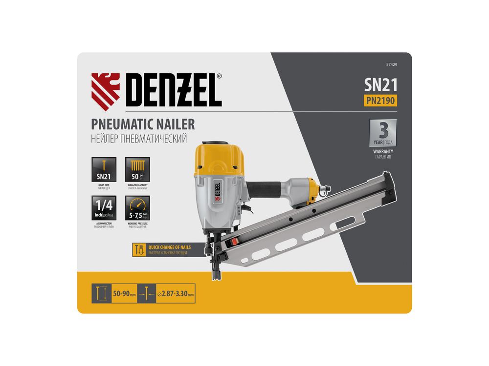Пневматический нейлер Denzel PN2190 57429 предназначен для сборки каркасов деревянных домов, стяжки полов, а также выполнения других работ по креплению листовых материалов с помощью гвоздей SN21 длиной от 50 до 90 мм. Рабочее давление составляет 7,5 атмосфер, что обеспечивает эффективность и высокую скорость забивания крепежа. Инструмент также пригодится для сборки мебели, строительных и отделочных работ.