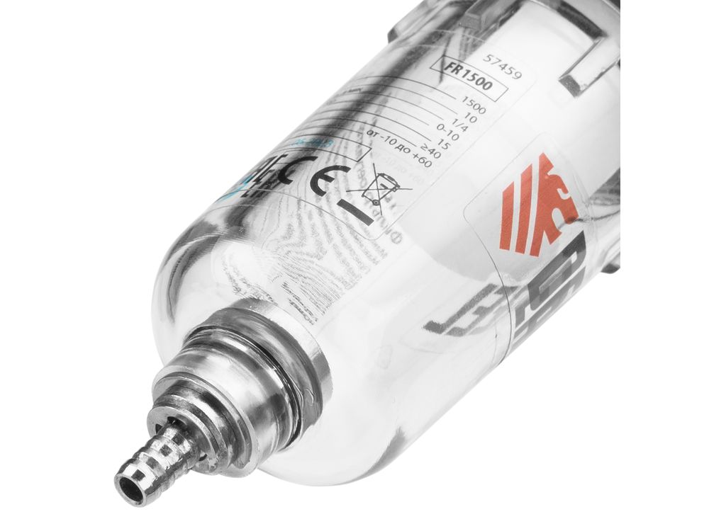 Фильтр-регулятор Denzel FR1500 57459 с присоединительным размером 1/4 и рабочим давлением 10 бар имеет пропускную способность 1500 л/мин и предназначен для подготовки сжатого воздуха, поступающего от компрессора: осушения и очищения от пыли и других твердых частиц размером от 40 мкм. Также позволяет устанавливать и поддерживать давление, необходимое для эффективной работы пневмоинструмента. Может эксплуатироваться при температуре от -10 °C до +60 °C. Фильтр-регулятор предназначен для бытового применения, также будет полезен в мастерской и гараже.