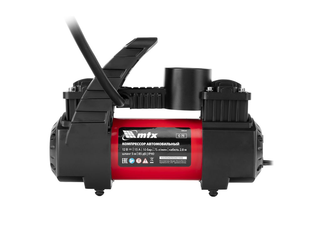 Автомобильный компрессор MTX C-75 58034 производительностью 75 л/мин работает от сети 12 В и подает сжатый воздух под давлением 10 атм. С его помощью можно быстро накачать шины автомобиля или велосипеда, а также подкачать мяч, надувной матрац, лодку и т.д. В комплект поставки включен набор из 3 насадок для эффективного решения различных задач. Компрессор подключается к автомобильному аккумулятору, незаменим в поездке и на отдыхе.