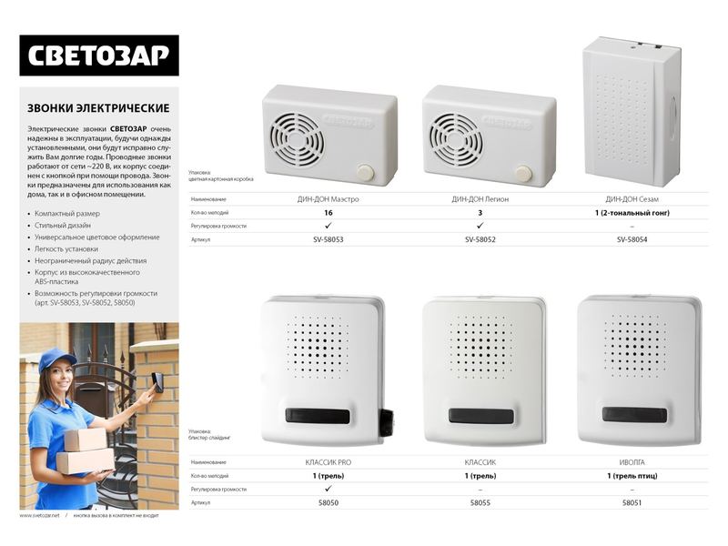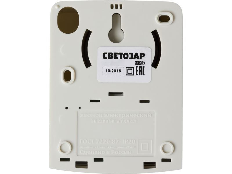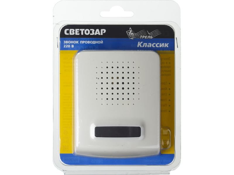 Электрический звонок СВЕТОЗАР может быть использован как дома, так и в офисном помещении. Корпус соединяется с кнопкой посредством провода, что обеспечивает дополнительную надежность изделия и неограниченный радиус действия. Звонок имеет мелодичное звучание. Прибор питается от сети переменного тока 220В.