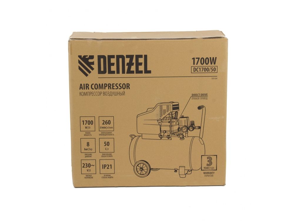 Воздушный компрессор с прямым приводом Denzel DC1700/50 58164 мощностью 1,5 кВт и производительностью 260 л/мин, с ресивером объемом 50 л, легко выдерживает интенсивные нагрузки, что позволяет использовать его как в быту, так и в профессиональной сфере. Объема ресивера 50 л и производительности на входе 260 л/мин достаточно для обеспечения работы пневмоинструмента, например, пневмошуруповерта, пневмонейлера, пневмостеплера. Быстроразъемные коннекторы Euro (Rapid) экономят время на подключение пневмомагистрали.