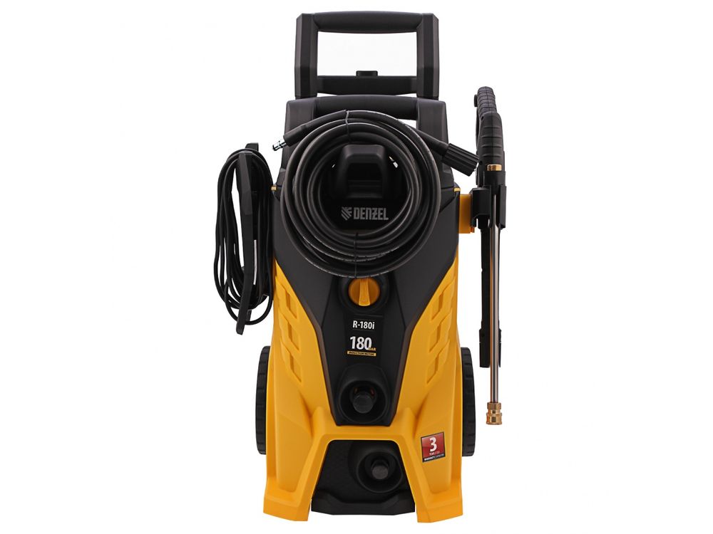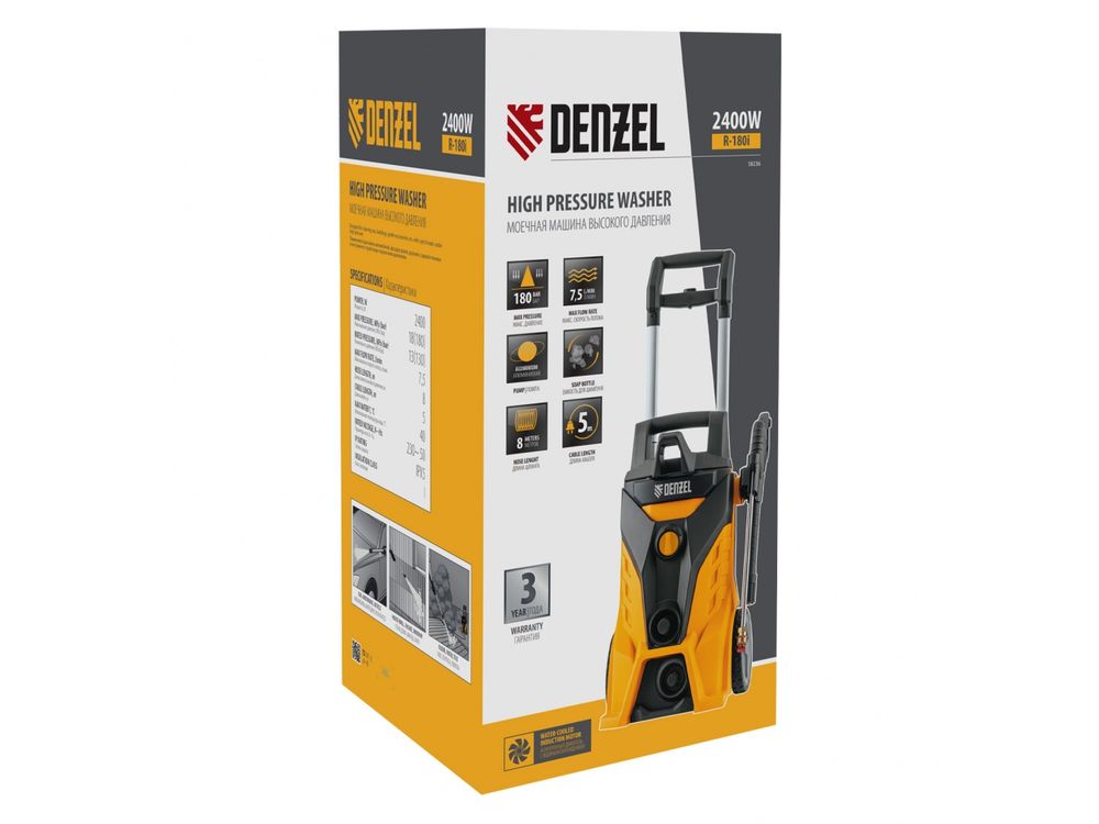 Моечная машина высокого давления Denzel R-180i с асинхронным двигателем оптимально подходит для очищения автомобилей, заборов, дорожек и садового инвентаря. Эффективно справляться с серьезными загрязнениями позволяют мощный мотор 2400 Вт и помпа с производительностью 7,5 л/мин и максимальным давлением 180 бар.,Отсутствие водопровода поблизости не станет проблемой. Мойка с насосом может производить забор воды из любых емкостей благодаря функции самовсасывания, при этом теряя не более 5% давления. Алюминиевая помпа со стальными плунжерами отличается высокой точностью подгонки деталей, что обеспечивает надежность и стабильное давление на выходе.