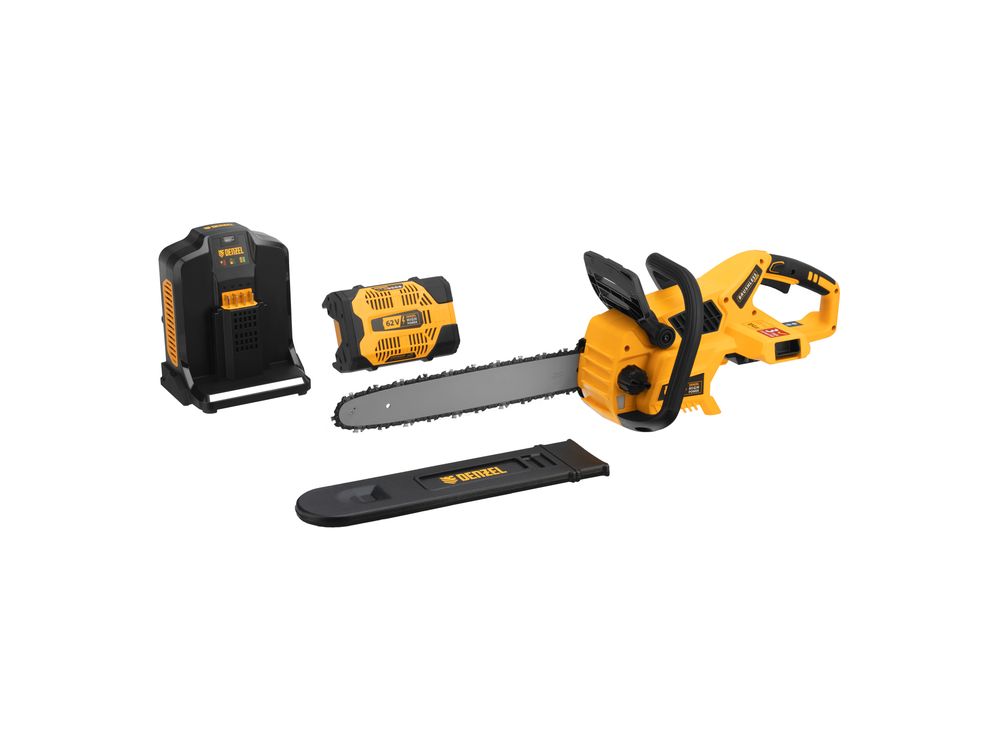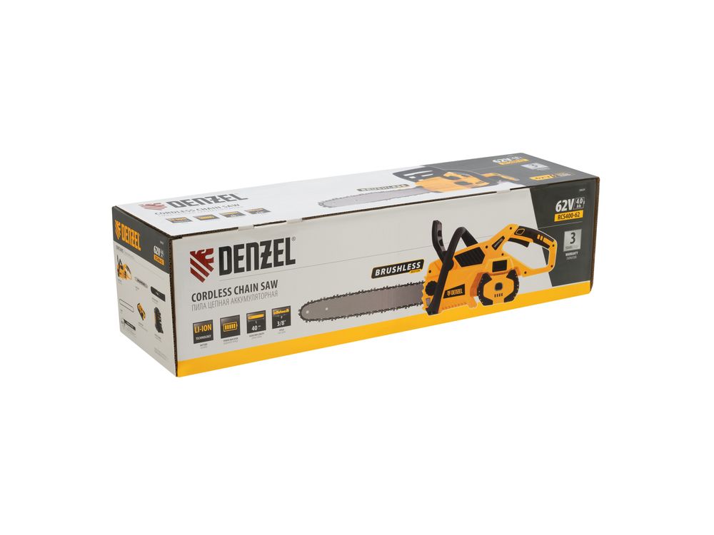 Пила цепная аккумуляторная Denzel RCS 400-62 58620 с шиной длиной 400 мм работает от аккумулятора Li-Ion с рабочим напряжением 62 В. Предназначена для заготовки дров, срезания массивных веток, валки деревьев, распиливания материалов из древесины любых пород. Мощный бесщеточный двигатель обеспечивает скорость вращения шпинделя 10500 об/мин, благодаря чему пила отличается высокой производительностью.