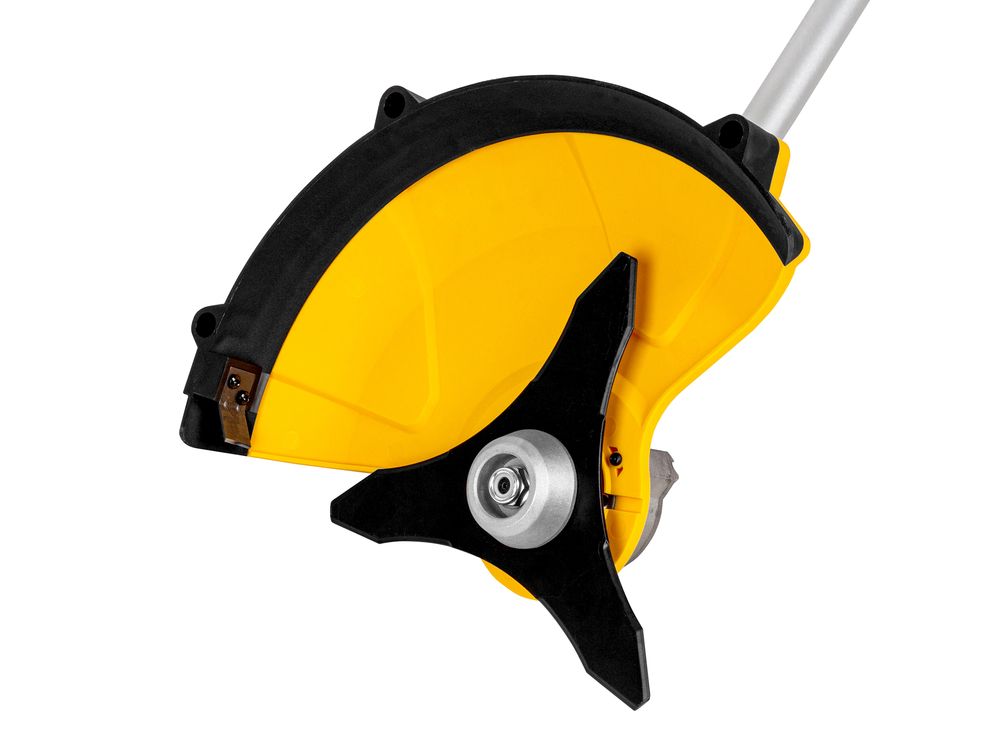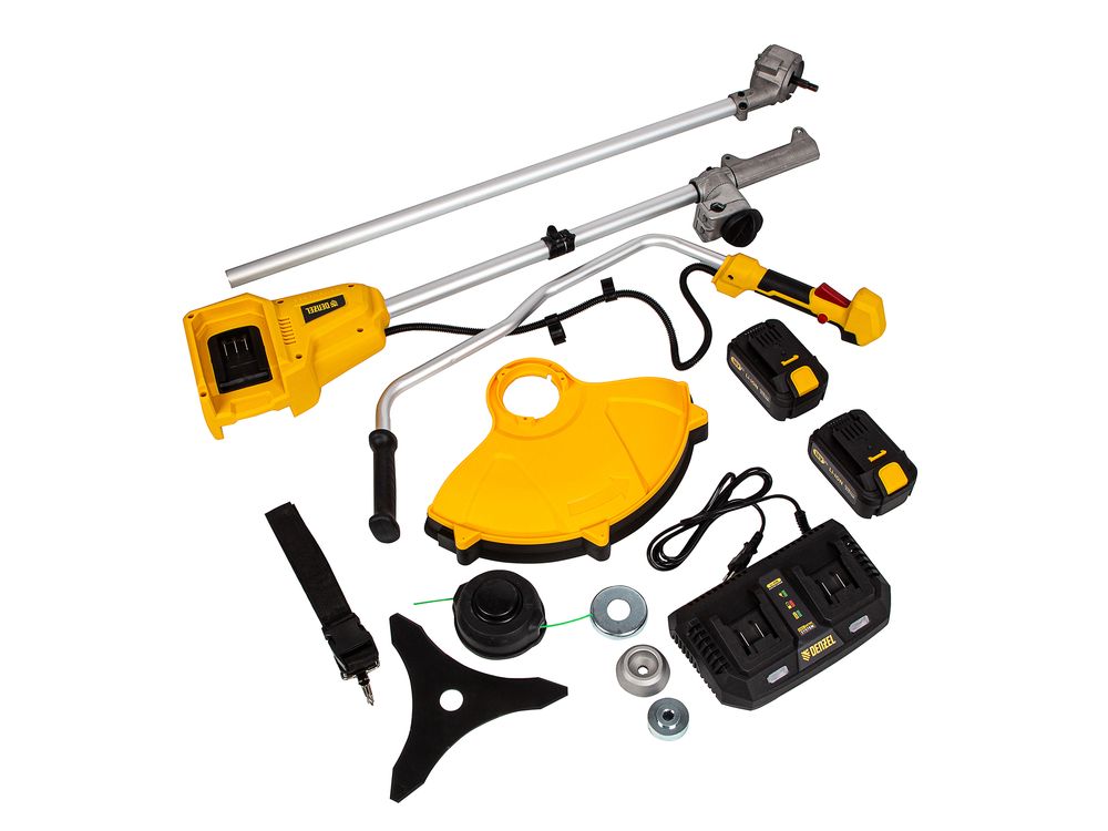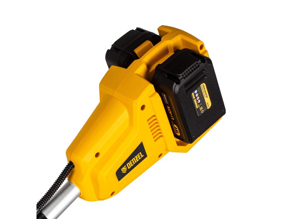 Аккумуляторный бесщеточный триммер Denzel CBC350-36 58720 с двумя батареями Li-ion, 36 В, используется для скашивания густой травы, сорняков и мелкого кустарника на приусадебном участке. В качестве оснастки используется катушка с леской диаметром 2 мм и трехлопастный нож. Ширина скашивания леской составляет 350 мм, ножом — 250 мм.,Триммер работает от двух аккумуляторов увеличенной емкости с интеллектуальной системой распознавания типа нагрузки. Бесщеточный электродвигатель обеспечивает частоту вращения шпули со скоростью 6500 об/мин — этого достаточно для эффективного решения поставленных задач. Т.к. техника не зависит от электросети, работать можно даже в самых отдаленных участках сада.