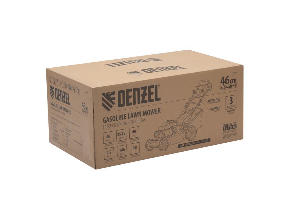 Бензиновая газонокосилка Denzel GLD-460SP-VE 58809 с приводом на колеса и вариатором оснащена двигателем объемом 146 см3 и электрическим стартером. Обеспечивает ширину скашивания 46 см за один проход и собирает траву в контейнер объемом 60 л. Идеально подходит для благоустройства дачной территории, обновления газонов и дорожек. Благодаря двигателю мощностью 4,5 л.с. справляется даже с густым бурьяном.,Ширина прохода составляет 46 см, за 1 час можно обработать участок площадью более 1220 м2. Высота среза регулируется при помощи рычага в соответствии с типом газона (всего 7 уровней, от 25 до 75 мм). Можно получить идеально ровный и низко подстриженный парадный покров или площадку для спортивных игр, функциональную лужайку с травой 4-6 см или садово-парковый газон с максимально высокой растительностью.