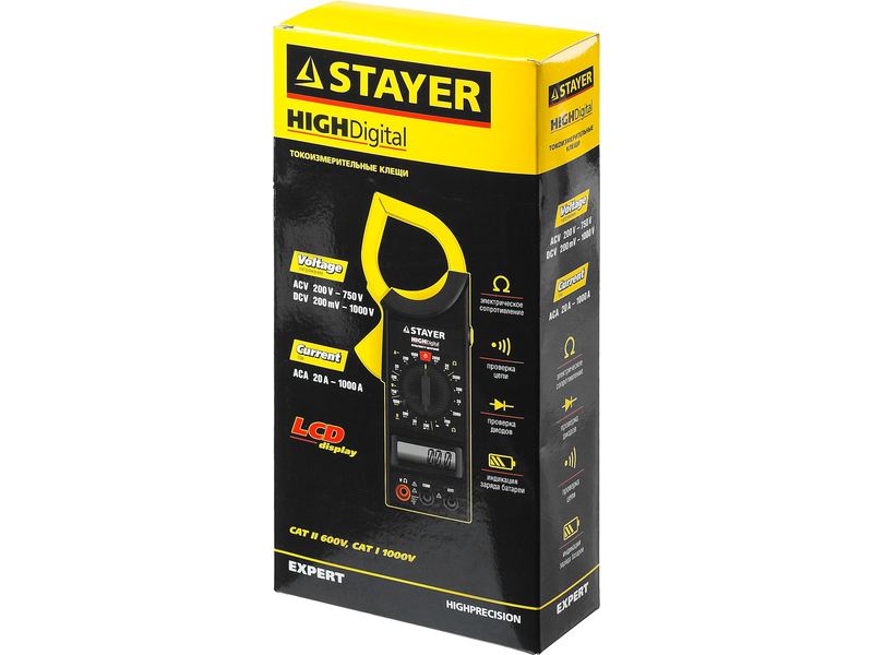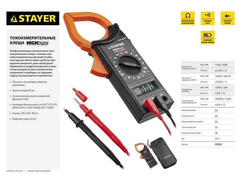 Профессиональные токоизмерительные клещи – точный прибор с полным спектром измерительных функций. Особая эргономичная конструкция и большой дисплей обеспечат удобство проведения измерений, даже одной рукой. • Высокая точность измерений • Прорезиненный противоскользящий корпус обеспечивает защиту прибора от различных механических повреждений • Эргономичный корпус с большим экраном • Простое и интуитивно понятное управление • Подсветка ЖК-дисплея • Автоматическое отключение питания • Компактный размер • Захват клещей 30 мм • Сохранение результата измерений (функция Hold) • Сохранение максимальных значений (MAX) • Диодный тест • Прозвонка цепей со звуком • Автоматическая индикация перегрузки • Категория безопасности по ГОСТ Р 52319 (МЭК 61010-1): КАТ III 600 B • Изоляция корпуса: двойная, класс 2 • Степень защиты по ГОСТ 14254: IP20