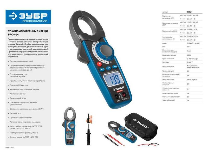 Профессиональные токоизмерительные клещи ЗУБР – точный прибор с полным спектром измерительных функций. Применение высококачественных материалов обеспечивает длительный срок службы. Токовые клещи незаменимы при проведении электромонтажных работ.