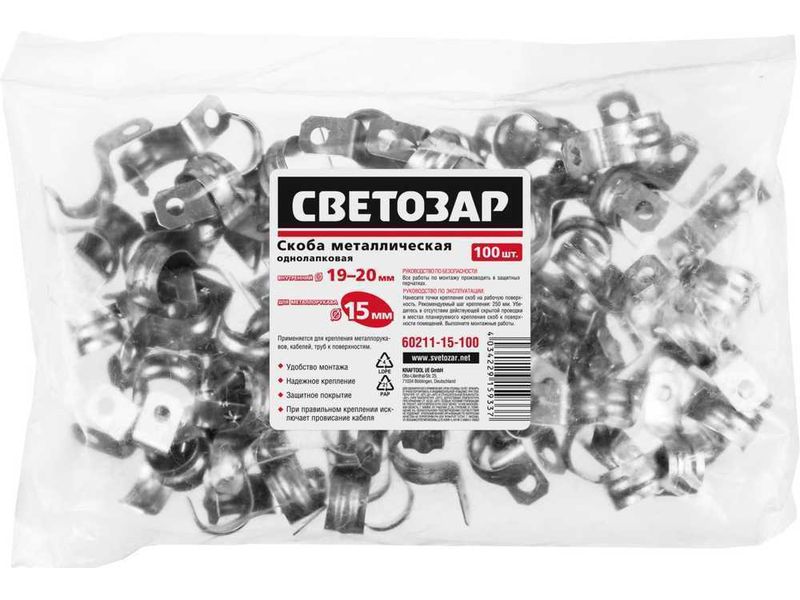 Купить Скобы СВЕТОЗАР металлические для крепления металлорукава d 15мм, однолапковые, 100шт
