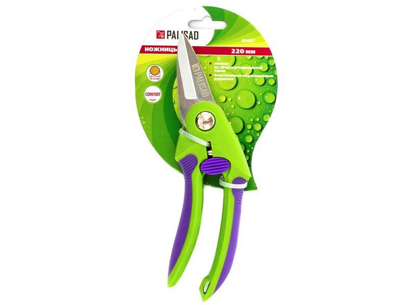 Цветочный секатор Palisad 60487 длиной 220 мм, с двухкомпонентными рукоятками, — садовый инвентарь для срезания молодых побегов и стеблей диаметром до 10 мм, а также оформления топиарных скульптур и крон бонсай. Срез получается ровным и чистым, поскольку лезвия движутся в параллельных плоскостях. Секатор может использоваться для разрезания картона, ткани, бумаги, подвязочного материала. Будет полезен дома и на даче.