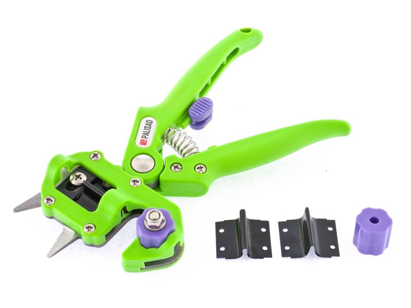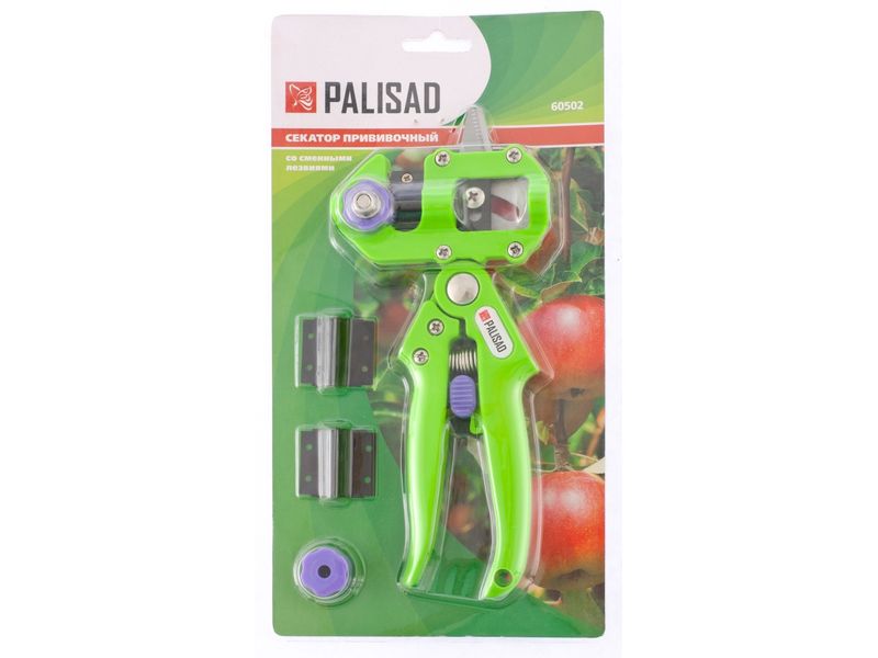 Прививочный секатор Palisad 60502 длиной 215 мм, со сменными ножами, используется для прививки плодовых растений черенком. Фигурные ножи секатора изготовлены из рессорно-пружинной стали, поэтому обладают высоким ресурсом (каждый рассчитан на 2000 срезов без дополнительной заточки). В комплекте U-образный, V-бразный и Q-образный ножи, позволяющие работать с черенками различной толщины и плотности. Вырезы, сделанные на подвое и привое, идеально совместимы друг с другом, дополнительная подгонка им не требуется.