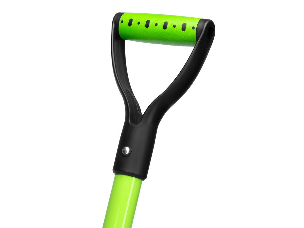 Продуманная конструкция — фибергласовый черенок не утяжеляет лопату и не разрушается под действием ультрафиолета, а удлиненная цельновырубная тулейка предотвращает его излом.