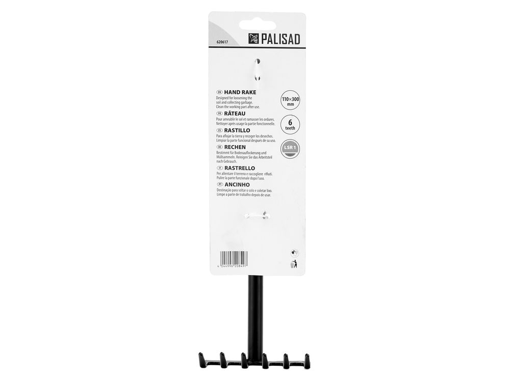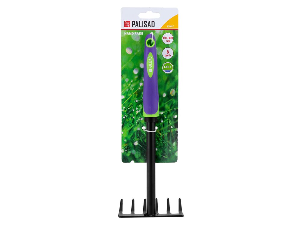 Стальные 6-зубые грабли Palisad LSR1 620617 длиной 300 мм, с рабочей частью шириной 110 мм и обрезиненной эргономичной рукояткой, используются для удаления мелкого мусора и срезанных стеблей, а также для рыхления почвы на небольших участках клумбах, грядках. Инструмент пригодится во время работы в цветнике или огороде.