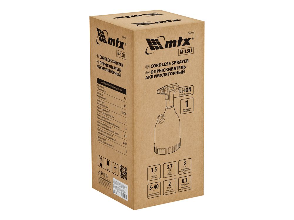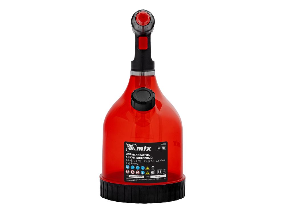 Аккумуляторный опрыскиватель MTX M-1,5LI 64792 с баком объемом 1,5 л и Li-Ion батареей на 3,7 В, емкостью 2 Ач, используется для ухода за растениями, а также распыления инсектицидных жидкостей, мытья окон, стен и дорожек. Регулировка факела распыления в сочетании с максимальной дальностью распыления 2 м позволяет обрабатывать участки различной площади и труднодоступные места. Опрыскиватель экономит силы и время пользователя, будет полезен в быту и на производстве.
