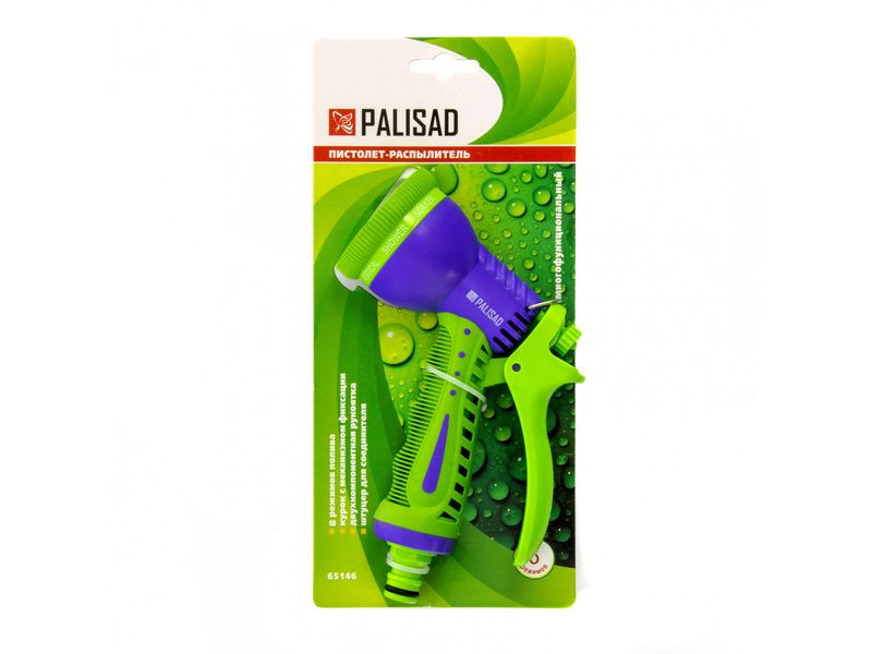 Пистолет-распылитель Palisad 65146 с 8 режимами работы предназначен для использования с любой из поливочных систем ТМ Palisad. Он повышает удобство и скорость работы при орошении растений, газонной травы, очищении садовых дорожек, мойке инструментов и др. работ, поэтому пригодится коммунальщикам и дачникам. Приспособление обеспечивает комфортную работу в 8 режимах: мелкодисперсном, конусном, сочащемся, распылении типа «туман» или душ, подаче жесткой, двойной плоско-вертикальной/горизонтальной струи.