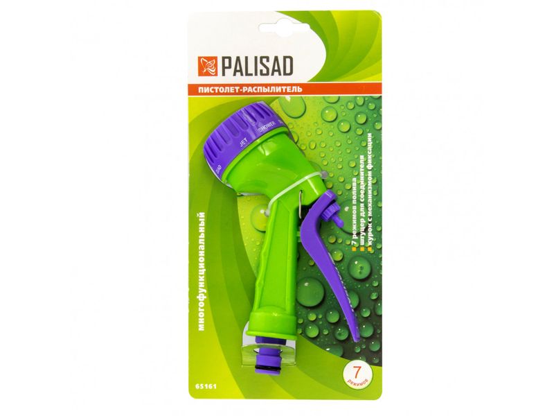 Пистолет-распылитель Palisad 65161 работает в 7 режимах: водоподача в виде жесткой, плоско-горизонтальной/вертикальной струи, обычного и мелкого тумана, с задействованием всех распыляющих отверстий, а также может использоваться как душ-пистолет. Относится к универсальным приспособлениям, т.к. совместим со всеми системами полива Palisad. Он значительно повышает скорость работы и поможет дачникам и коммунальщикам ухаживать за участком, садом, парком: поливать растения, газон, чистить дорожки, рабочий инвентарь и т.д.