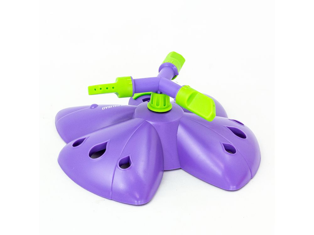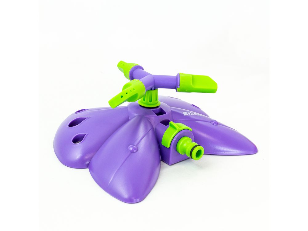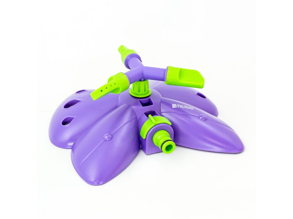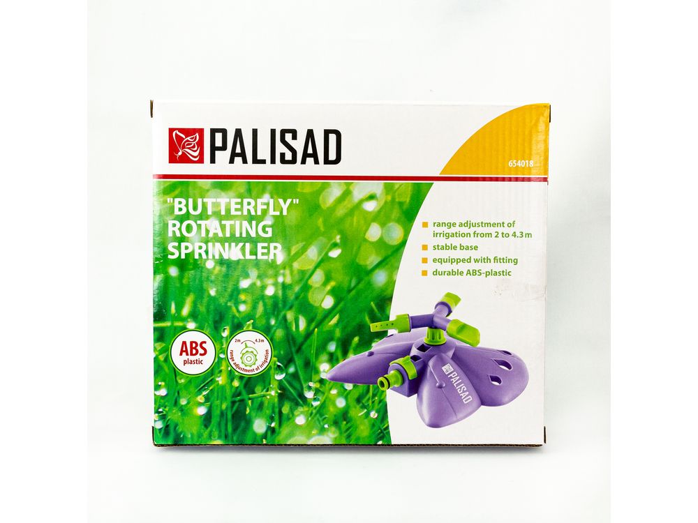 Вращающийся разбрызгиватель Palisad «Бабочка» с 3 лопастями, с регулировкой, используется для орошения газонов и садовых участков. Максимальная площадь полива составляет 58 кв.м. Дальность распыления можно варьировать от 2 до 4,3 м. На каждой лопасти 4 отверстия, обеспечивающие равномерный полив. Основание выполнено в форме бабочки, что придает устройству оригинальный вид.