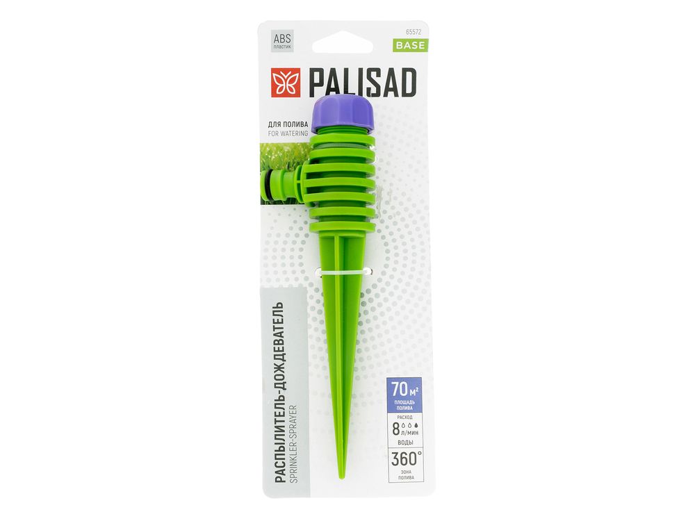 Распылитель-дождеватель Palisad 65572 на пике предназначен для организации автоматического полива газона, клумб, кустарников и т.д. Благодаря ему можно быстро оросить растения, не тратя времени и сил на работу вручную. Площадь полива составляет 70 кв. м, расход воды - 8 л/мин, что делает распылитель оптимальным для небольших участков.
