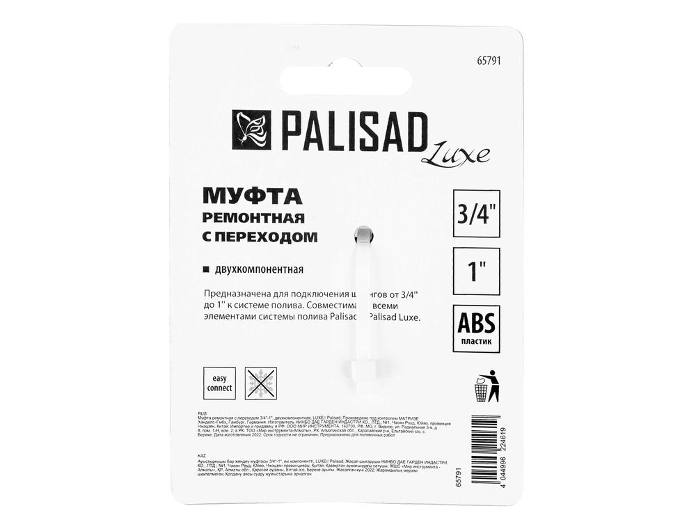 Ремонтная муфта Palisad Luxe 65791 в двухкомпонентном корпусе, с переходом 3/4-1, позволяет создать оросительную систему из шлангов разного размера. С помощью муфты можно удлинить линию для полива больших территорий.