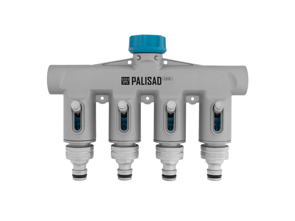 Четырехканальный штуцерный разветвитель Palisad LUXE 65833 с внутренней резьбой 3/4, из алюминия, предназначен для разделения водопроводной магистрали. Его устанавливают на магистральный отвод или резьбовой кран либо подключают к линии через адаптер. Соединяется со шлангами при помощи адаптеров. Поможет смонтировать надежную систему полива на дачном участке.