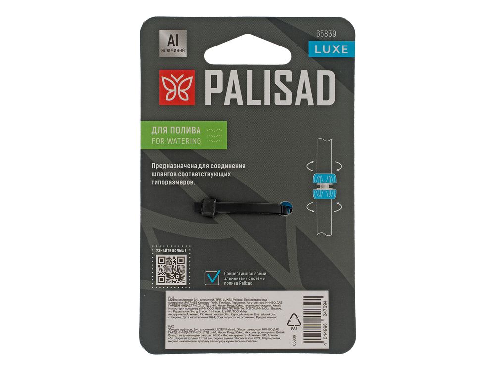 Муфта ремонтная алюминиевая Palisad LUXE 65839 позволяет соединить два шланга диаметром 3/4. С ее помощью можно удлинить поливочную линию или отремонтировать поврежденный участок шланга.