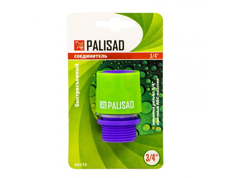 Пластмассовый быстросъемный соединитель Palisad 66175 с внешней резьбой 3/4 дюйма используется для подключения шланга через переходник к крану или отводу, имеющему выход с внутренней резьбой. Облегчает монтаж поливочной линии на дачном участке.