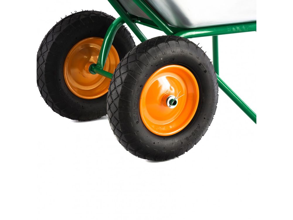 Маневренность и хорошая балансировка — благодаря пневмоколесам с двумя шарикоподшипниками в каждом тачка не проваливается в грунт и сохраняет устойчивость на поворотах.