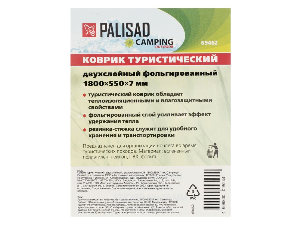 Двухслойный туристический коврик Palisad Camping 69462 размером 1800 х 550 х 7 мм, с фольгированным слоем, позволяет организовать комфортный отдых даже на сырой холодной земле. Не пропускает влагу, а фольгированный слой способствует эффективному сохранению тепла. Коврик незаменим во время туристического похода.