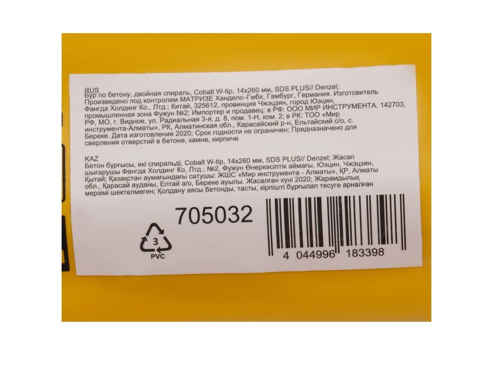 Бур по бетону Denzel Cobalt W-tip 705032 размером 14 х 260 мм, с хвостовиком SDS-plus и двойной спиралью, предназначен для сверления бетона, кирпича и камня. Используется в качестве оснастки для перфораторов с патроном SDS-plus. Бур оптимален для проведения строительных, ремонтных, монтажных работ.