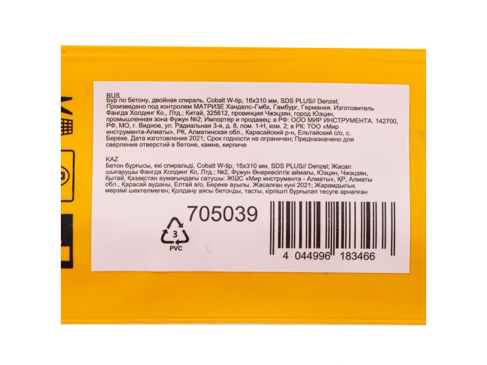 Бур по бетону Denzel Cobalt W-tip 705039 размером 16 х 310 мм, с хвостовиком SDS-plus и двойной спиралью, предназначен для сверления бетона, кирпича и камня. Используется в качестве оснастки для перфораторов с патроном SDS-plus. Бур оптимален для проведения строительных, ремонтных, монтажных работ.
