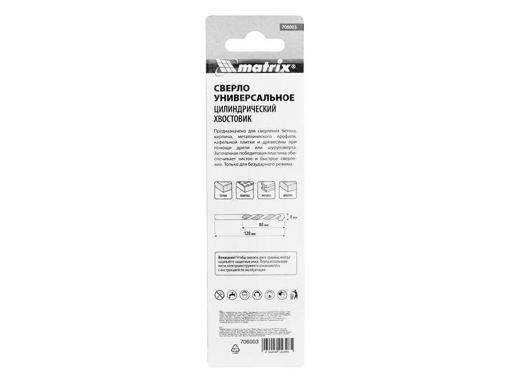 Универсальное сверло Matrix 706003 длиной 120 мм позволяет получать отверстия диаметром 8 мм в древесине, керамической плитке, а также в стали и бетоне с помощью дрели или шуруповерта. Твердосплавная режущая пластина обеспечивает эффективную работу с любыми материалами. Сверло пригодится в мастерской, гараже, а также дома и на даче.