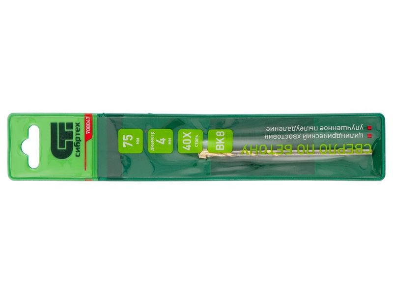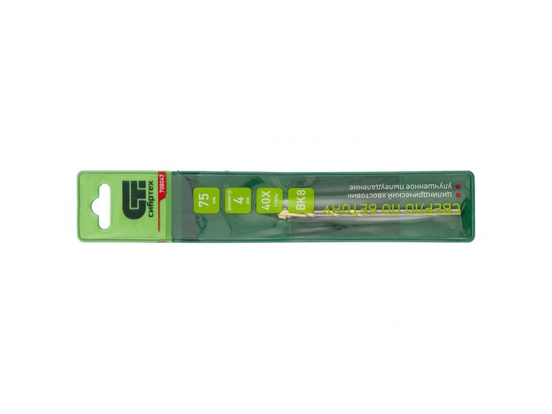 Сверло по бетону Сибртех 708047 диаметром 4 мм и длиной 75 мм, с цилиндрическим хвостовиком и улучшенным пылеудалением, предназначено для сверления в ударном режиме бетона и кирпича. Пригодится во время строительных и ремонтных работ.