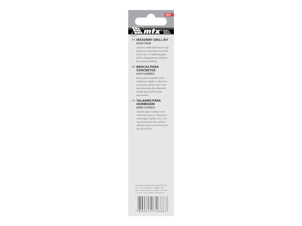 Сверло MTX 708629 размером 12 х 150 мм, с цилиндрическим хвостовиком, устанавливается на дрели для получения отверстий в бетоне, кирпиче, мраморе и других твердых материалах. Оно рассчитано на полупрофессиональное использование, подходит и для осуществление ремонтных/монтажных работ в быту.