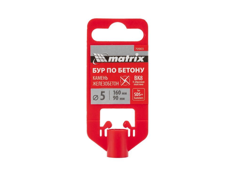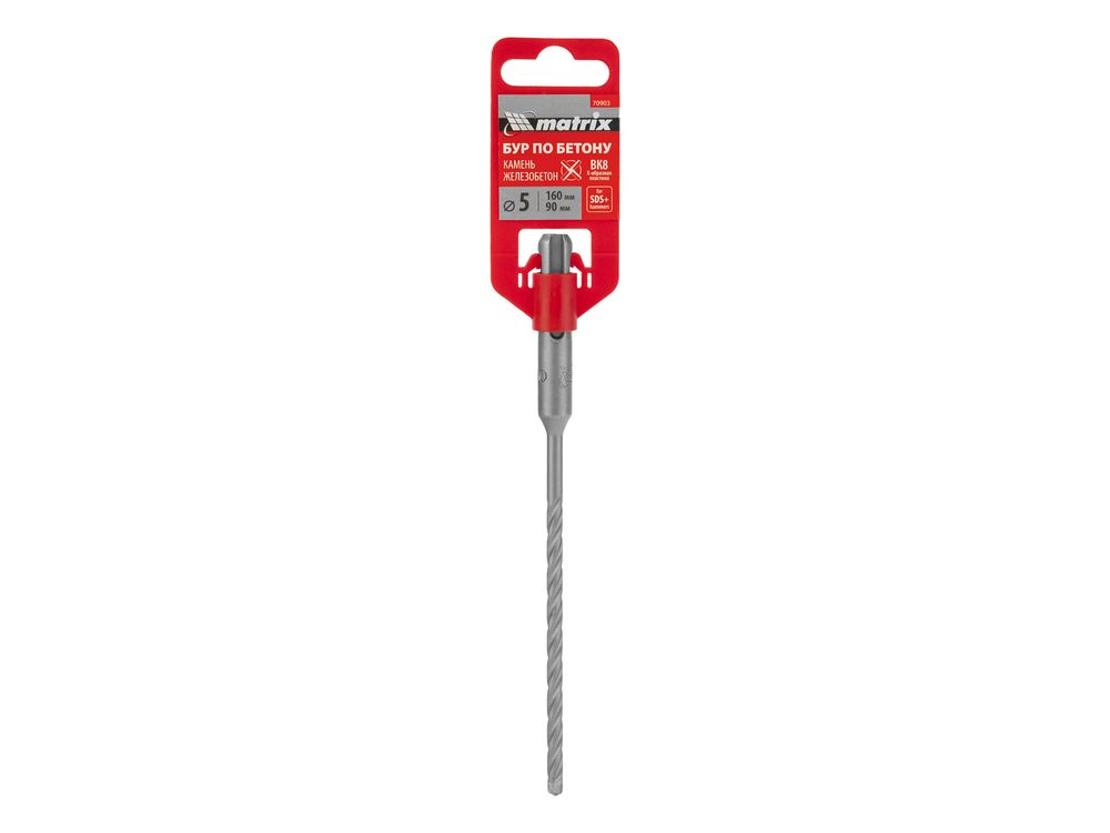 Бур по бетону Matrix 70903 длиной 160 мм, с хвостовиком SDS-plus и крестовой пластиной, предназначен для получения отверстий диаметром 5 мм в бетоне, камне и кирпиче. Крестовая пластина обеспечивает эффективную работу с твердыми материалами, в том числе армированным бетоном. Бур устанавливается в патрон перфоратора и используется во время проведения строительных работ.