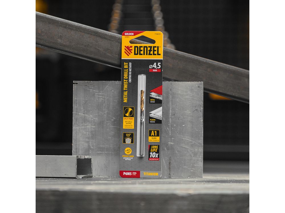 Спиральное сверло по металлу Denzel Golden Tip 718231 из стали P6M5, размером 4,5 х 80 мм, предназначено для получения отверстий в легированных и цветных металлах — меди, алюминии, мягкой бронзе, титане, латуни. Оснастка позволяет эффективно справляться с поставленными задачами благодаря оптимальному углу заточки 135°. Класс точности A гарантирует высокое качество полученных отверстий. Сверло используется для проведения монтажно-сборочных работ.