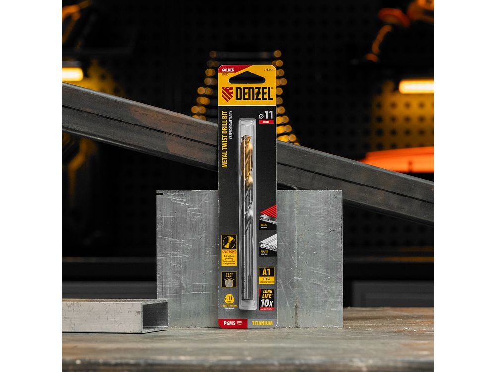 Спиральное сверло по металлу Denzel Golden Tip 718243 из стали P6M5, размером 11 х 142 мм, предназначено для получения отверстий в легированных и цветных металлах — меди, алюминии, мягкой бронзе, титане, латуни. Оснастка позволяет эффективно справляться с поставленными задачами благодаря оптимальному углу заточки 135°. Класс точности A гарантирует высокое качество полученных отверстий. Сверло используется для проведения монтажно-сборочных работ.