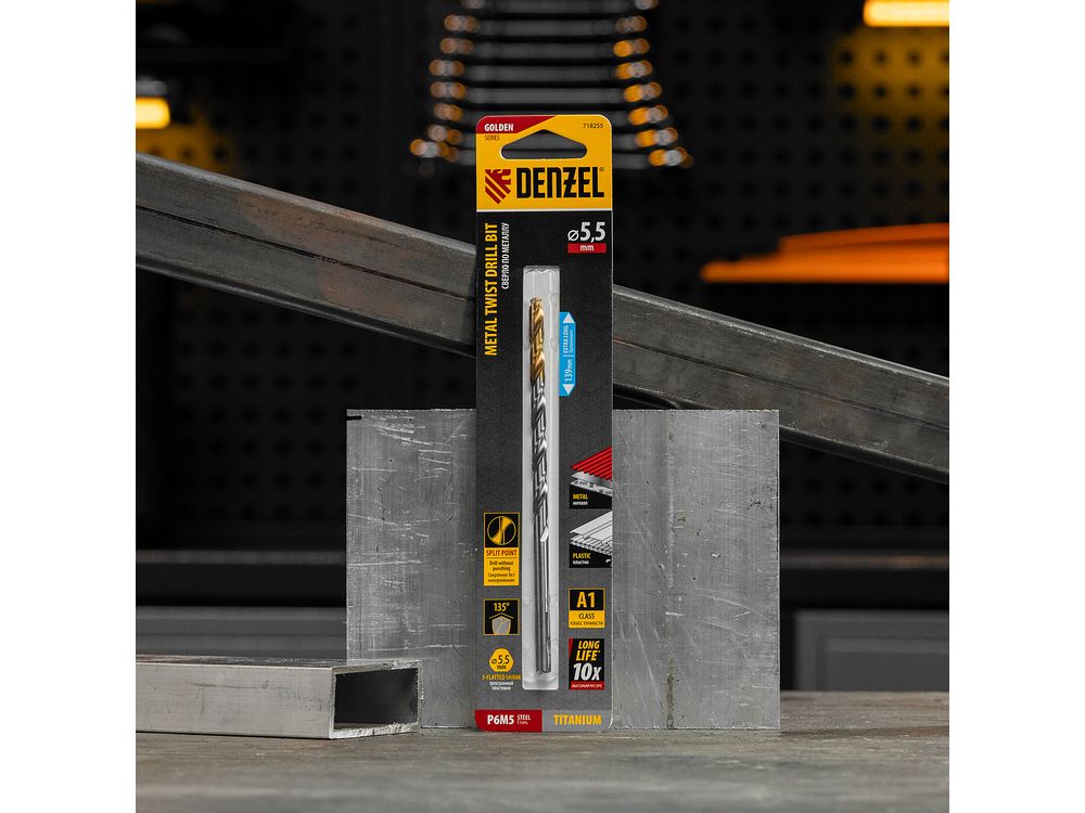 Удлиненное спиральное сверло по металлу Denzel Golden Tip 718255 из стали P6M5, размером 5,5 х 139 мм, предназначено для получения отверстий в легированных и цветных металлах — меди, алюминии, мягкой бронзе, титане, латуни. Оснастка позволяет эффективно справляться с этими задачами благодаря оптимальному углу заточки 135°. Класс точности A гарантирует высокое качество работ, а удлиненный профиль позволяет сверлить глубокие отверстия. Сверло используется для проведения монтажно-сборочных работ.