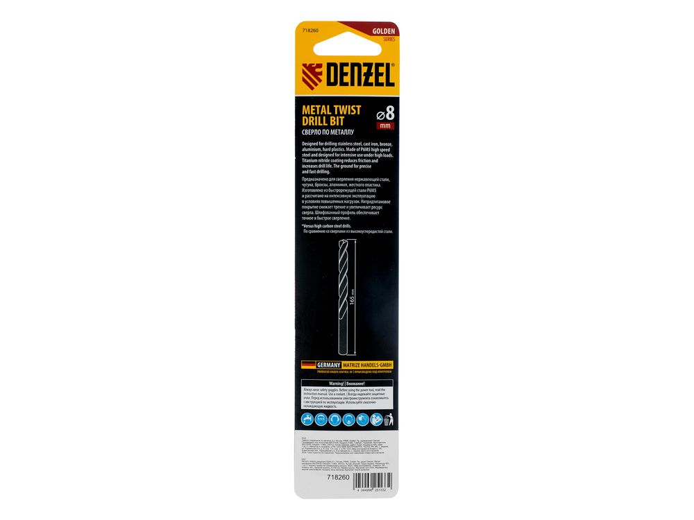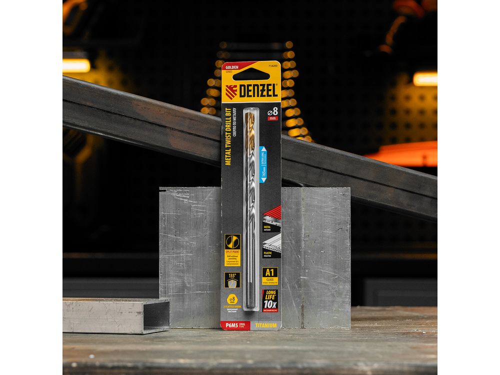 Удлиненное спиральное сверло по металлу Denzel Golden Tip 718260 из стали P6M5, размером 8 х 165 мм, предназначено для получения отверстий в легированных и цветных металлах — меди, алюминии, мягкой бронзе, титане, латуни. Оснастка позволяет эффективно справляться с этими задачами благодаря оптимальному углу заточки 135°. Класс точности A гарантирует высокое качество работ, а удлиненный профиль позволяет сверлить глубокие отверстия. Сверло используется для проведения монтажно-сборочных работ.