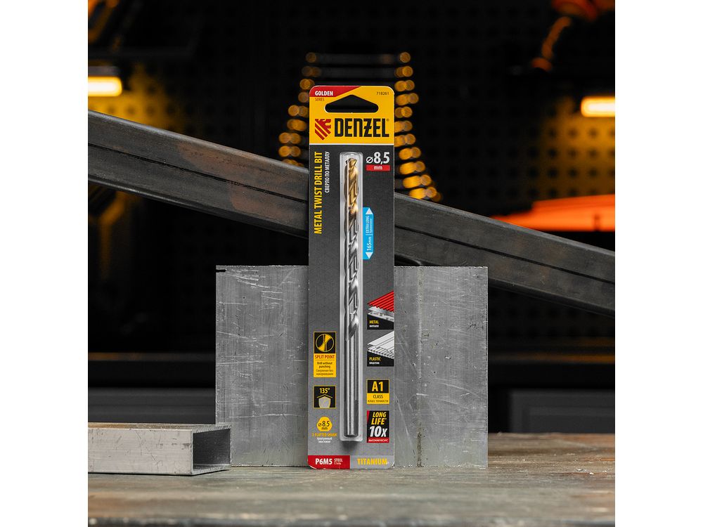 Удлиненное спиральное сверло по металлу Denzel Golden Tip 718261 из стали P6M5, размером 8,5 х 165 мм, предназначено для получения отверстий в легированных и цветных металлах — меди, алюминии, мягкой бронзе, титане, латуни. Оснастка позволяет эффективно справляться с этими задачами благодаря оптимальному углу заточки 135°. Класс точности A гарантирует высокое качество работ, а удлиненный профиль позволяет сверлить глубокие отверстия. Сверло используется для проведения монтажно-сборочных работ.