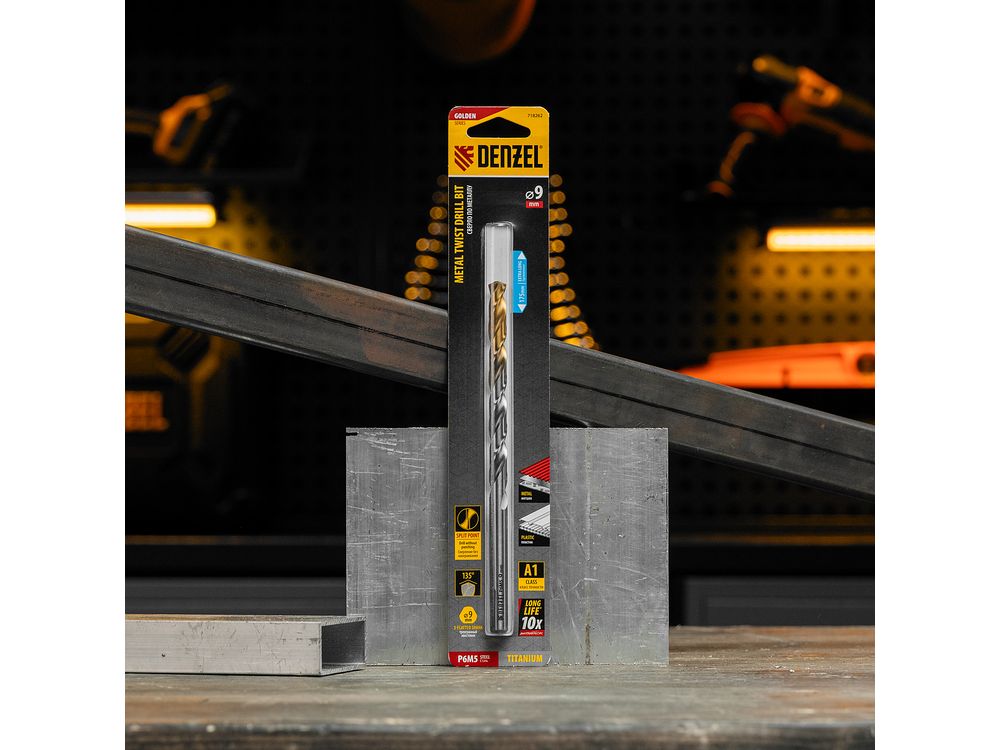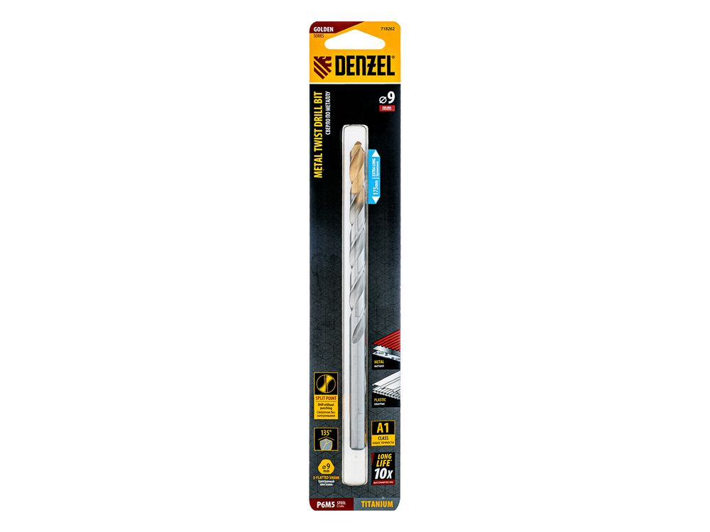 Удлиненное спиральное сверло по металлу Denzel Golden Tip 718262 из стали P6M5, размером 9 х 175 мм, предназначено для получения отверстий в легированных и цветных металлах — меди, алюминии, мягкой бронзе, титане, латуни. Оснастка позволяет эффективно справляться с этими задачами благодаря оптимальному углу заточки 135°. Класс точности A гарантирует высокое качество работ, а удлиненный профиль позволяет сверлить глубокие отверстия. Сверло используется для проведения монтажно-сборочных работ.