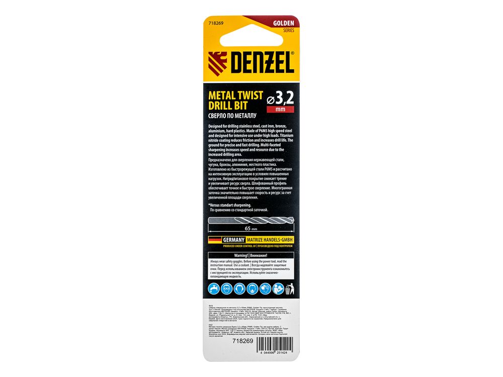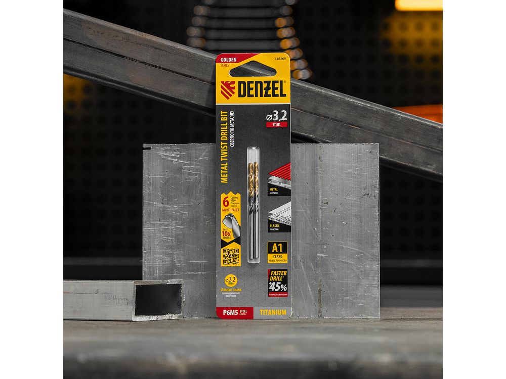 Спиральное сверло по металлу Denzel Golden Tip 718269 из стали P6M5, размером 3,2 х 65 мм, с многогранной заточкой, 2 штуки в упаковке, предназначено для получения отверстий в легированных сталях и цветных металлах. Многогранная заточка позволяет получать чистые и ровные отверстия практически без заусенцев. Сверлу присвоен класс точности A, что гарантирует высокое качество работ. Оснастка подходит для бытового и профессионального применения.