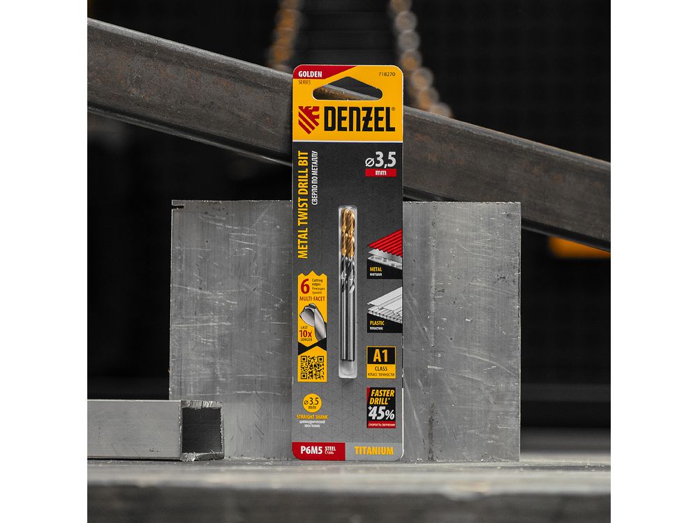 Спиральное сверло по металлу Denzel Golden Tip 718270 из стали P6M5, размером 3,5 х 70 мм, с многогранной заточкой, 2 штуки в упаковке, предназначено для получения отверстий в легированных сталях и цветных металлах. Многогранная заточка позволяет получать чистые и ровные отверстия практически без заусенцев. Сверлу присвоен класс точности A, что гарантирует высокое качество работ. Оснастка подходит для бытового и профессионального применения.